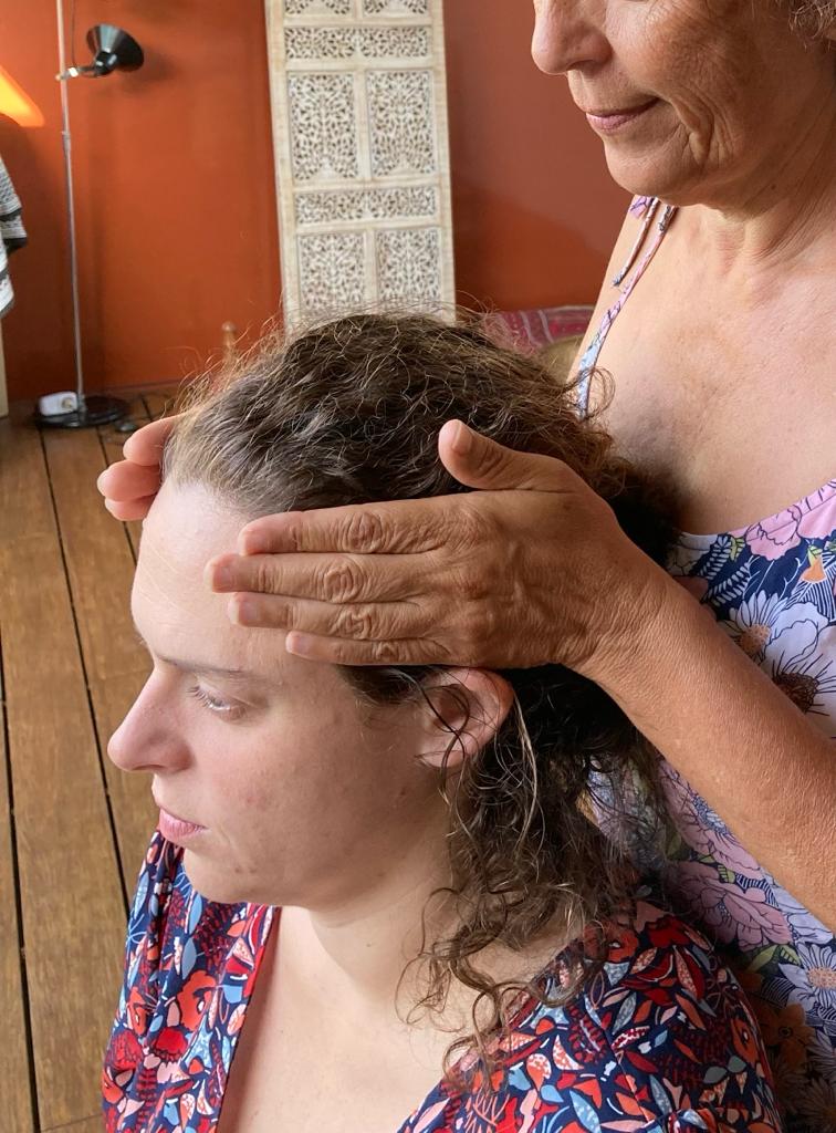 Le champissage est un massage des épaules, de la nuque, du cuir chevelu et du visage.